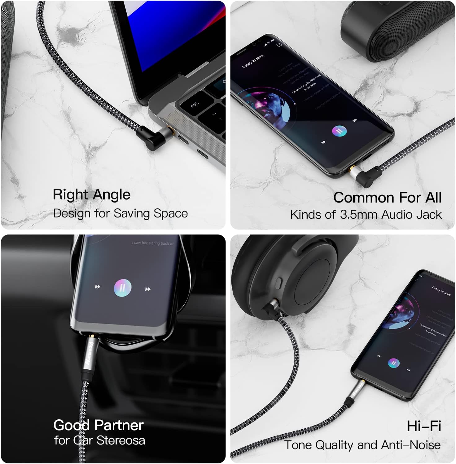 Introducing the 3.5mm Audio Cable 6ft/1.8M, a high-quality stereo aux cable designed for superior audio performance. This cable features a 90-degree right angle design, making it perfect for connecting your headphones, tablets, speakers, and other audio devices without any awkward bending or tangling.