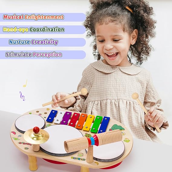 Kids Drum Set for Toddlers,8 in 1 Montessori Musical Instruments,Wooden Preschool Sensory Toys,Percussion Instruments Gifts for Boys and Girls