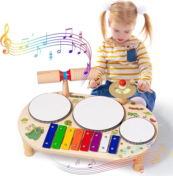• 8 in 1 Multi-Function Music Toy: The kids drum set contains 1* wooden tone block,1* crash cymbal,1* xylophone, 3* drums, 2* drum sticks, multi-function wooden sensory toy is easier to stimulate children’s interest in music.The toddler musical instruments contains small accessories, suitable for children over 3 years old.Baby under 3 years old need to be accompanied by a parent.