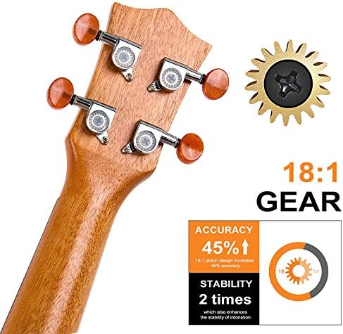 - SEALED 18: 1 GEAR TUNING MACHINE: In the higher gears, the ukulele string can be tuned more precise, keep ukulele stay in tune better than 15:1 gear tuning pegs, ensures you would not be troubled by ‘out of tune’ so fast. Our gear made of pure copper will be harder, less rusting. than ever. easy your playing.